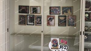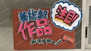 夏休み中から、1階昇降口の作品棚をリニューアルしています。注目されやすいよう上下に大きくカラフルな手描きポップを掲示し、1作品ずつ額に入れ、ガラス戸の枠に被らず作品が観られるように配置を工夫しました。これから、中央の仕切り棚に布を張り、立体作品を展示していく予定です。完成した鑑賞棚にご期待ください!