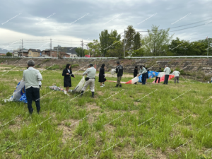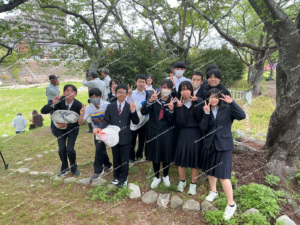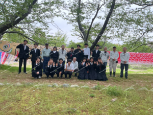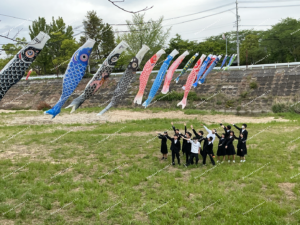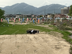 4月22日(水) 式典後、午後から、生徒会役員と実行委員会で坂内川に鯉吹かしを行いました。育成会の方々が下準備をしてくださり、生徒は贈呈していただいた6匹の鯉のぼりを取り付けて巻き上げました。地域の方も河川に見学しにきていました。取材を受けるなどして殿町校区の伝統を誇らしげに語る生徒の様子に、みんなが笑顔になりました。